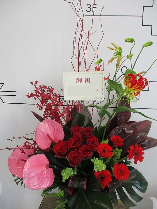 赤でまとめたアレンジ。還暦祝いにぴったり。