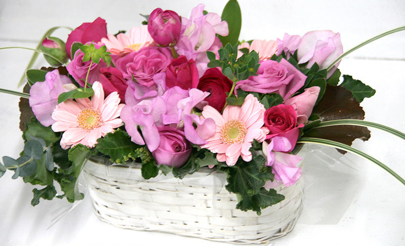 一般のお客様向けのフラワーアレンジメントは、あらかじめバスケットや陶器・樹脂の器などに美しくあしらい、受け取った人の手を煩わせることなくそのまま鑑賞していただけるようお作りいたします。