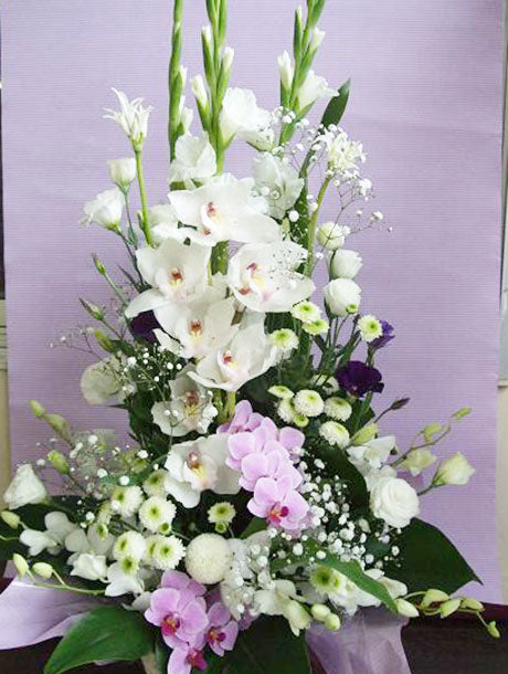 アクセントにピンク胡蝶蘭、カスミソウをプラスしたアレンジです。