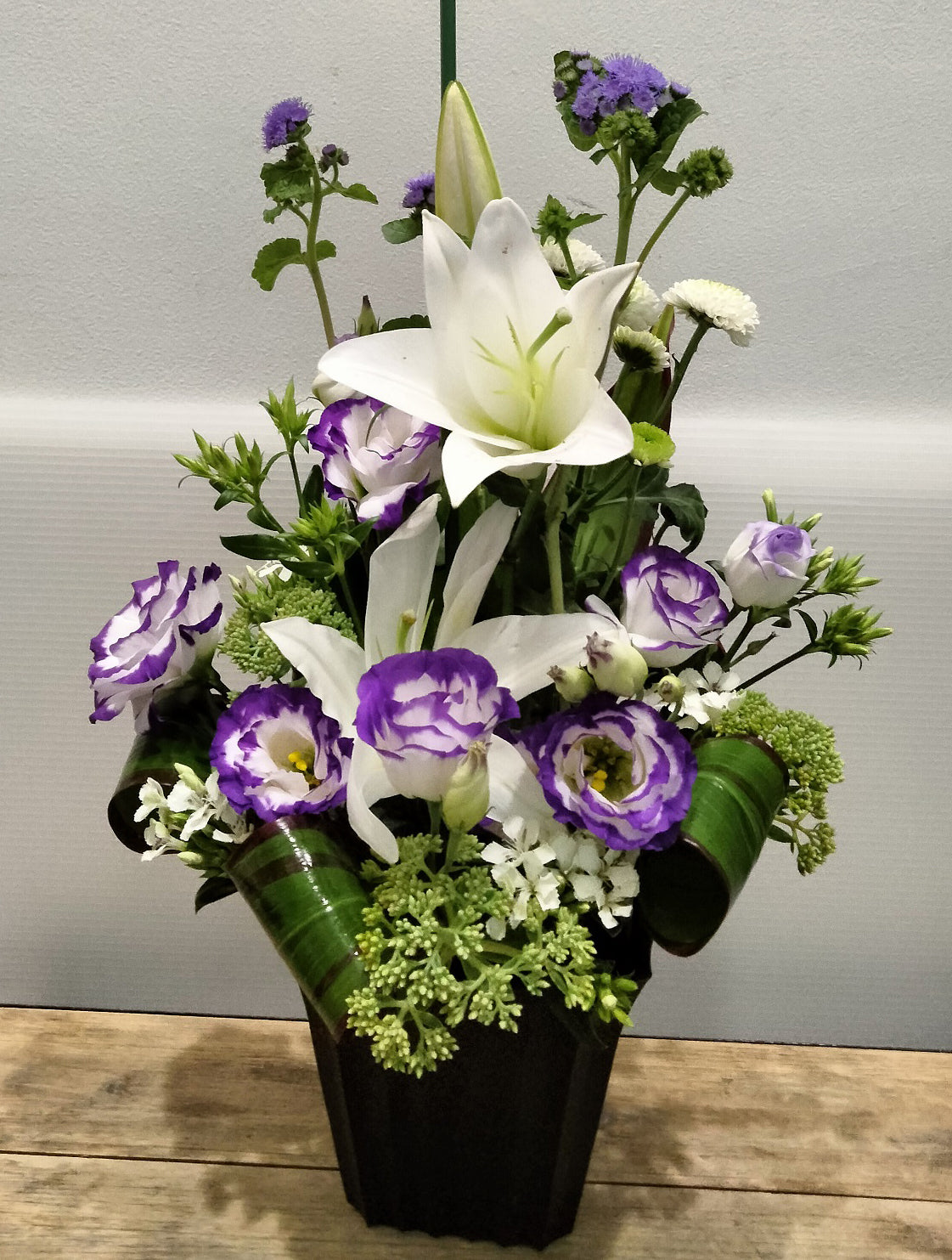 一般のお客様向けのフラワーアレンジメントは、あらかじめバスケットや陶器・樹脂の器などに美しくあしらい、受け取った人の手を煩わせることなくそのまま鑑賞していただけるようお作りいたします。