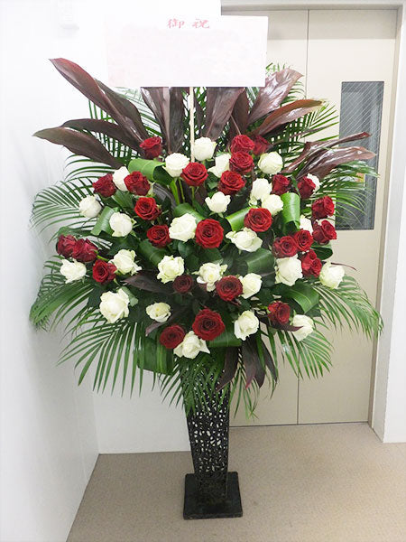 深紅と白バラの大変縁起の良いスタンド花。3日以上前までに要予約。