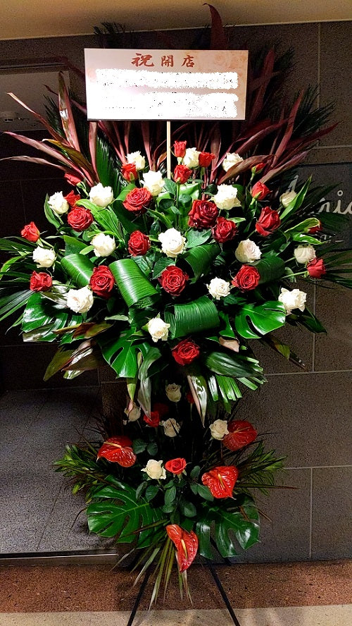 ボリュームがありゴージャスな2段スタンド花。3日以上前迄に要予約。