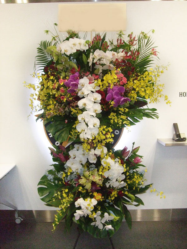 胡蝶蘭をふんだんに使ったスタンド花。お祝い会場に是非。