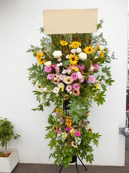 ヒマワリ、ガーベラ、バラ、季節の枝物